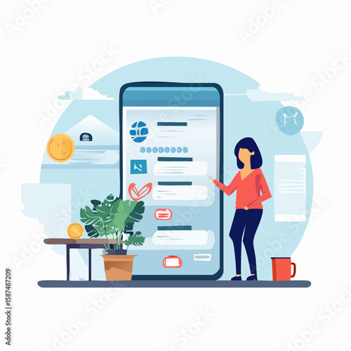AI working better than human, flat vector illustration. Robot machine and business woman working on computers and marking checklist. AI vs human productivity. Robots superiority.