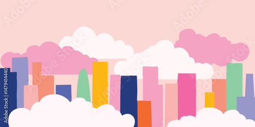 Vector layered paper cut style sky, fluffy clouds, plane flying over city buildings. Worldwide travel, air flight, time to travel concept for web banner, website page etc.