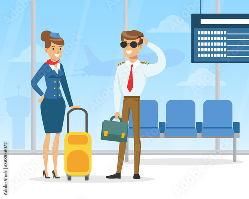 Vector illustration of air stewardess serving first class passenger on the flight. Flat style design.