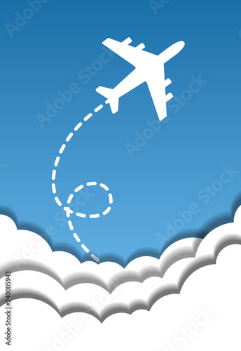 Air travel and tourism vector with plane flying over cityscape, business skyscrapers high-rise buildings paper cut craft illustration. Transport and transportation, vacation and adventure concept