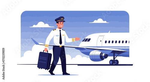 Airline cabin crew, pilot and stewardess cartoon characters wearing face masks standing in front of plane, flat vector illustration. New antiviral flight rules, new normal of air travel, safe flight.