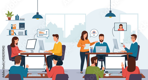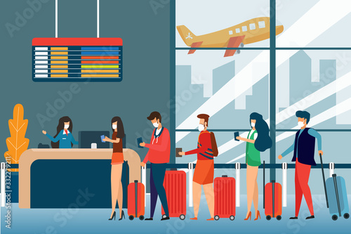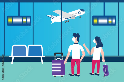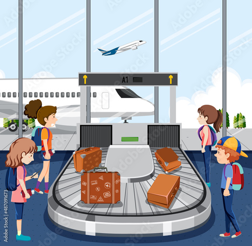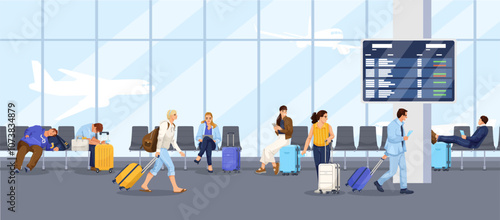 Airport hall interior with people waiting for flight, moving by buggy car, flat vector illustration. Airport buggy services for transit and transfer passengers.