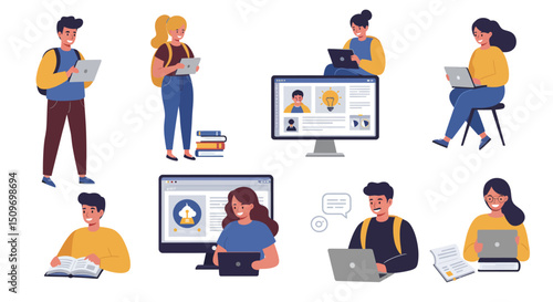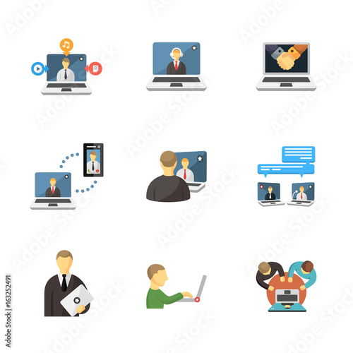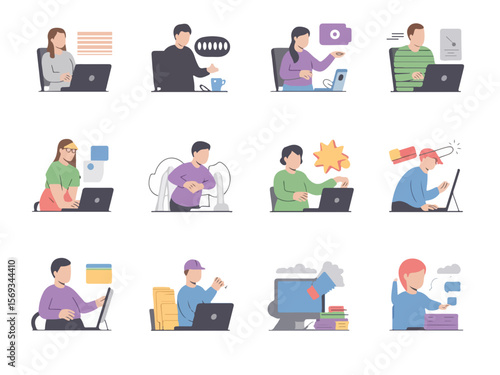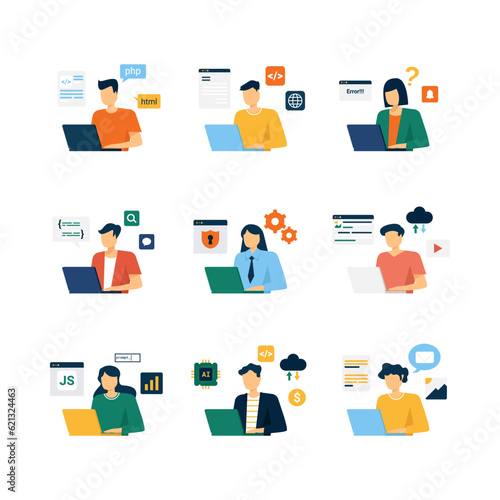 Airport people vector icon set with pilot, stewardess, ticket counter, ramp agent and passengers making online ticket reservation, passing security checkpoint at airport terminal. Flat style design.
