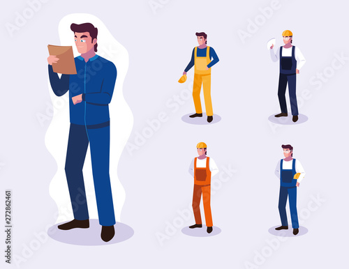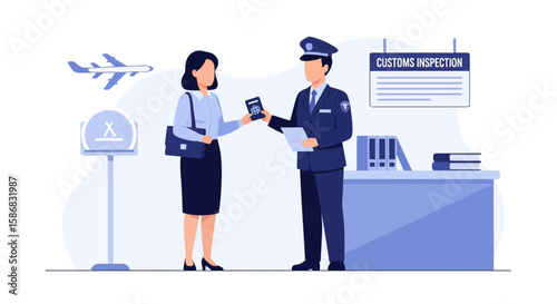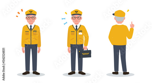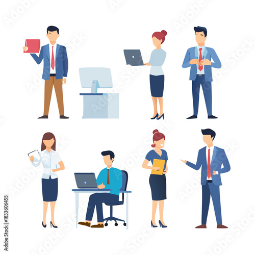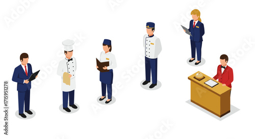 Vector illustration of pilot, stewardess, ramp agent, ticket agent and passenger with luggage. Airport people flat style design element, icon isolated on white background.