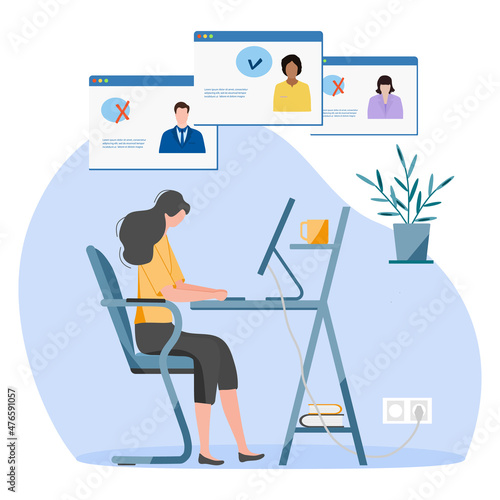 Airport waiting hall. Girl passenger with luggage, passport and ticket waiting for flight, flat vector illustration. Airport lounge. Travel by plane.
