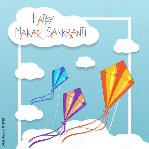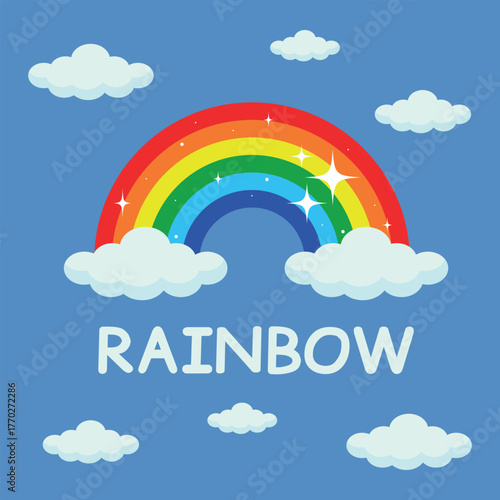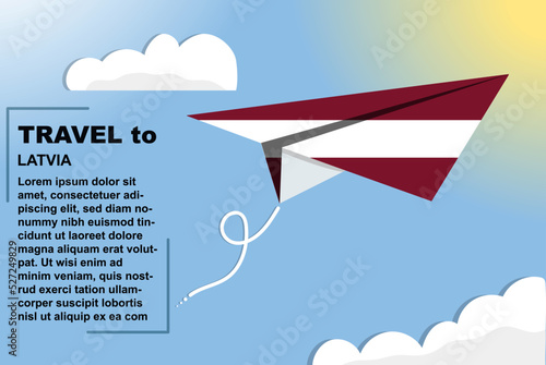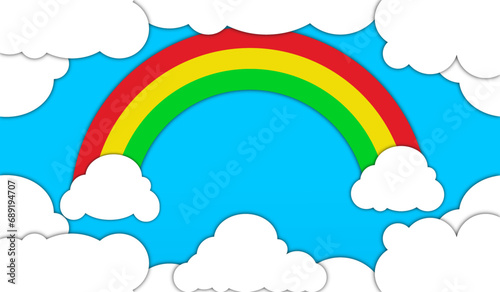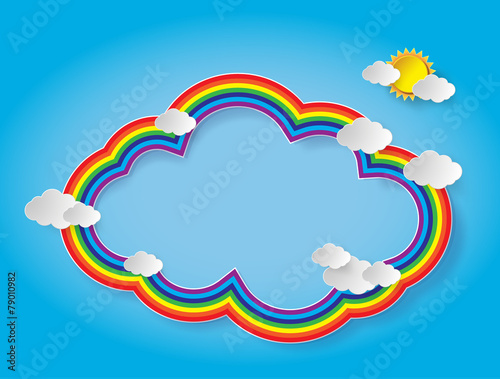Airship with red ribbon rainbow and clouds in the sky. Vector illustration in paper art style. Travel poster banner design template.