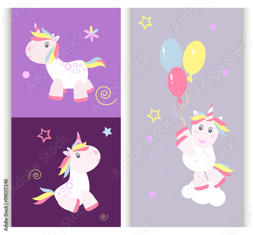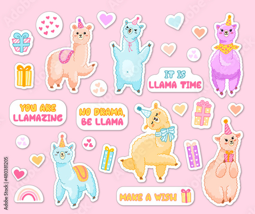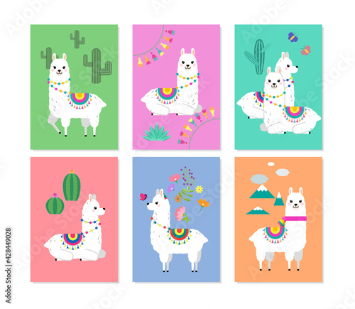 Cute alpaca birthday greeting cards. Vector hand drawn illustration. Happy birthday card templates for kids with funny color llamas holding balloons, gift boxes, cake, flowers.