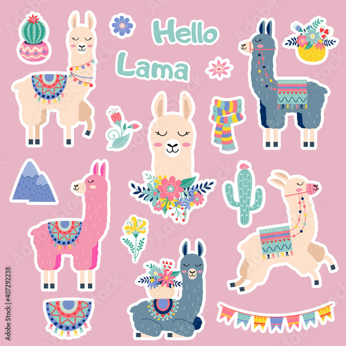 Cute alpaca stickers. Vector hand drawn funny pink, yellow, blue cartoon llamas and cactuses.