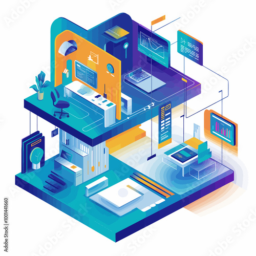 Alternative energy concept vector flat illustration. Isometric car, laptop, smartphone and city house connected to battery charging with energy produced by solar panels and wind turbines.
