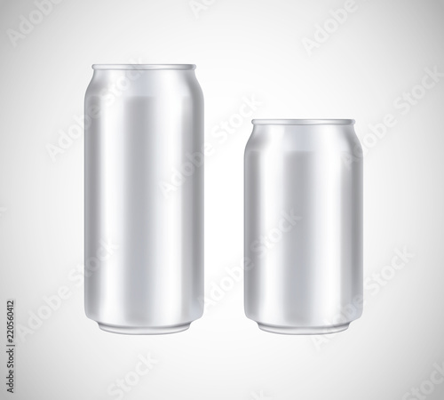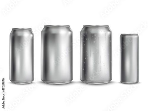 Aluminum can mockup isolated vector set. Blank beer or soda drink metal tin bottle. Silver container template for cola beverage. Package for brand design