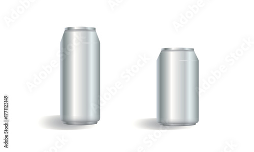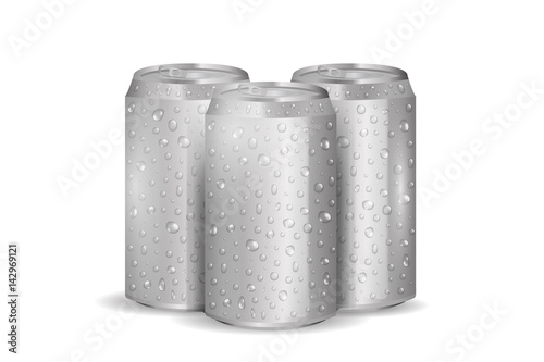 Aluminum cans with water drops realistic design. Blank wet metal silver tin for soda or beer cold drink isolated on white background. Vector mockup
