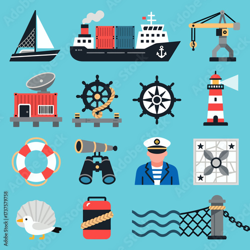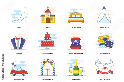 Amusement park vector flat icon set with circus tent, roller coaster, carousel, ferris wheel, bumper cars attractions, ice cream cart, ticket office and happy family with balloon and ice-cream.