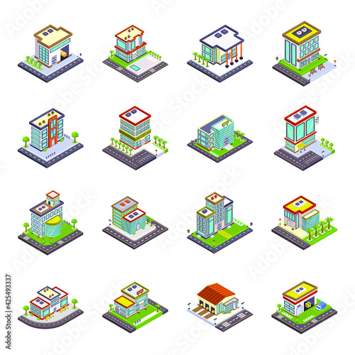 Amusement park vector flat isometric icon set with roller coaster carousel castle ferris wheel circus tent shooting range bumper cars train ride areas, cotton candy and hot dog carts, ticket office.