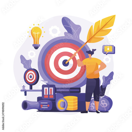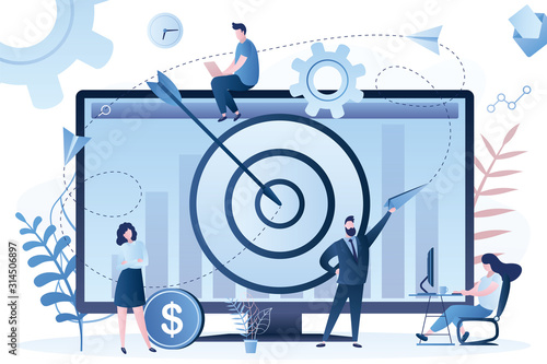 Vector illustration of tiny characters business analysts or auditors analysing statistical data to make strategic business decisions using big laptop computer with target on screen. Analytics concept.