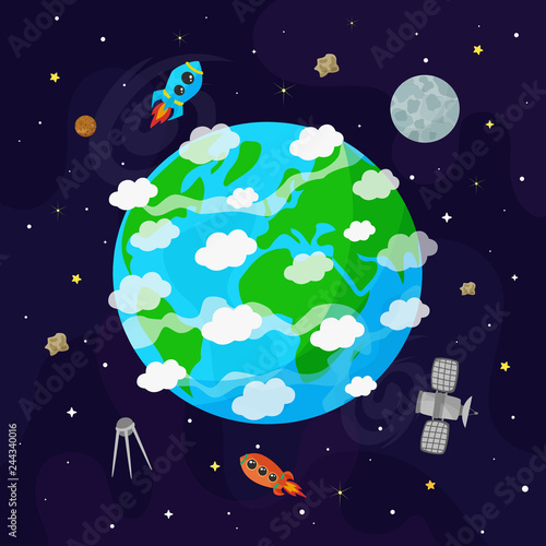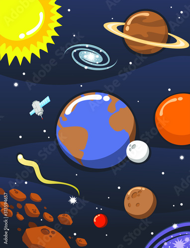 Ancient solar system with huge turtle, elephants holding planet Earth surrounded other space object vector illustration. Old vision, alternative theory of universe