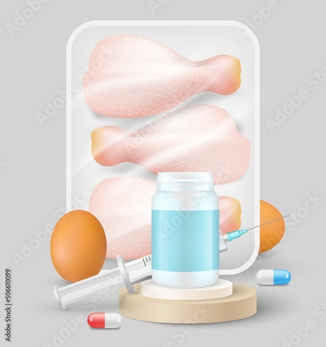 Antibiotic chicken and eggs vector illustration. Pharma food. Poultry legs in pack. Preservatives, drug, hormones and steroids for speed fowl growth in laboratory