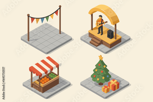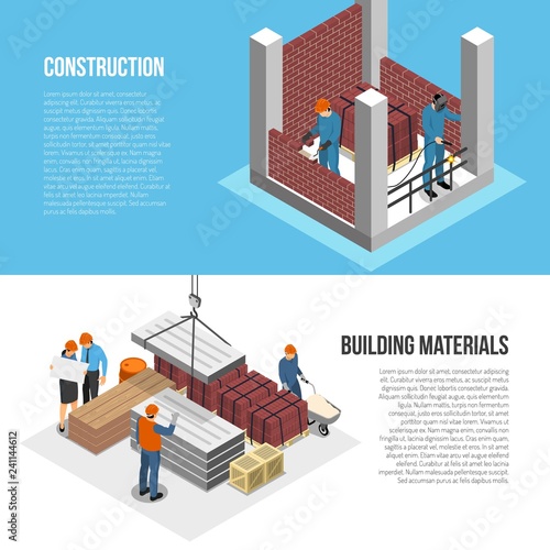 Apartment construction vector flat isometric poster, banner set. Foundation and columns, Floor installation, Walls building, Doors and windows design elements.