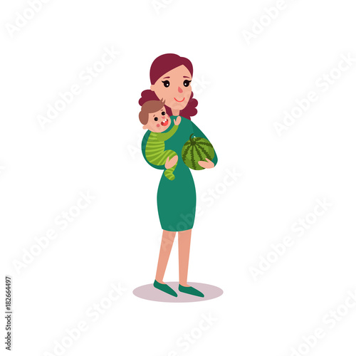 Vector illustration of woman holding basket full of apples. Apple hunting season concept flat style design element, icon isolated on white background.