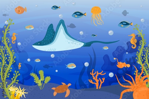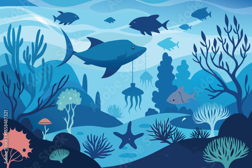 Vector layered paper cut style deep ocean bottom landscape with coral reef, fish, seaweed. Beautiful underwater world in public aquarium in paper art craft style. Underwater sea walk attractions.