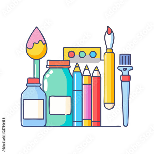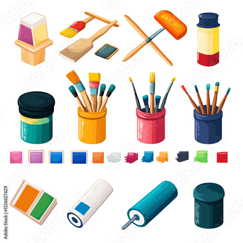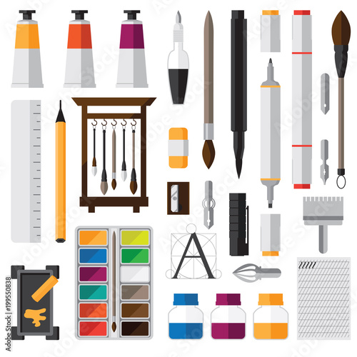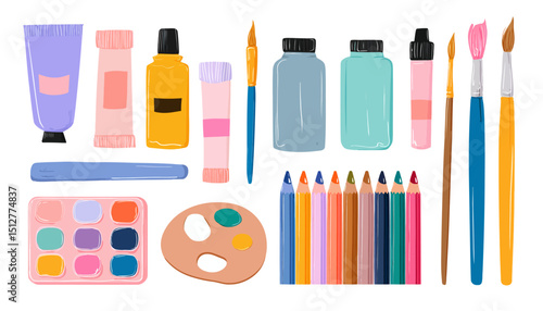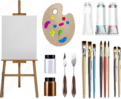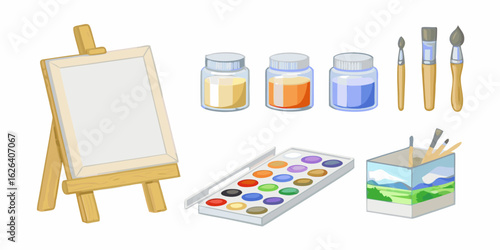 Art painting tools and accessories, vector isolated illustration. Art equipment and supplies, artist tools and materials easel with canvas, palette, painting brushes, paint tubes, pencil, watercolor.
