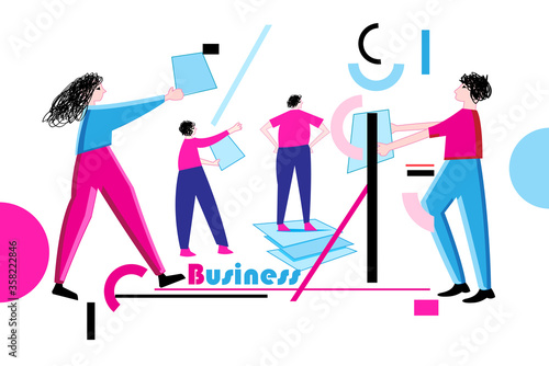 Micro male and female characters artists painting on huge sketching board using paints, vector illustration. Art classes, creative arts workshop, painting studio concept for web banner, website page.