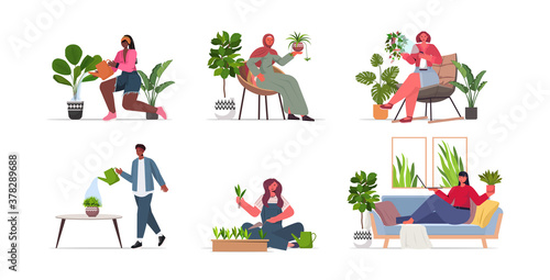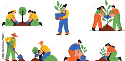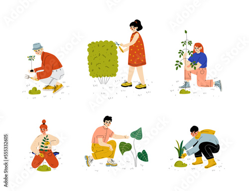 Asian farmer male and female character set, vector flat isolated illustration. People planting rice seedlings, picking tea leaves and fruit. Asian agriculture, rice farming, gardening, tea production.