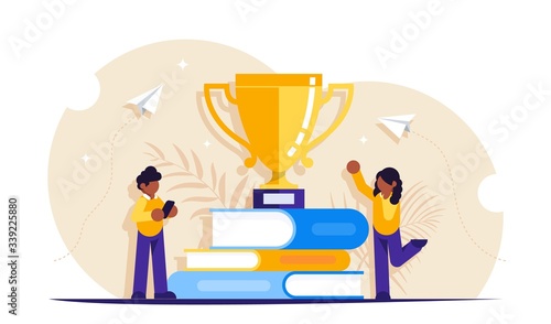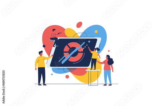 Road repair, maintenance and construction vector illustration. Male characters workers driving yellow asphalt compactor roller, working with shovel, holding traffic cone. Asphalt pavement installation