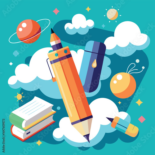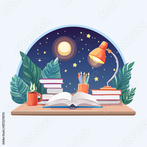 Astronomy science poster background with book, telescope education stuff, observatory for cosmos outer space studying over starry night sky planet, comet, meteor and star constellation