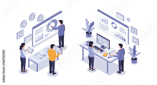 Auction scene with auctioneer calling out starting price, buyers making bids, flat vector isometric illustration. Auction and bidding concept.