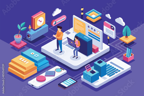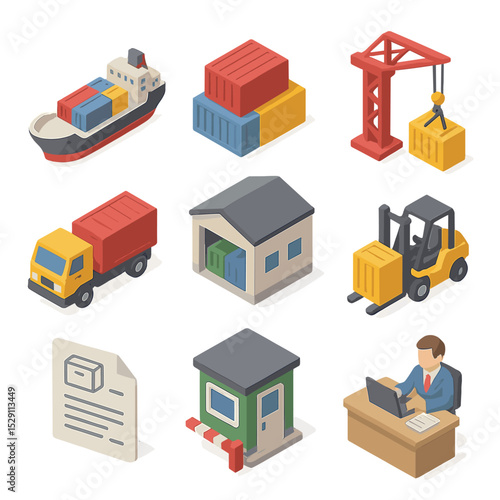 Cargo robots, flat vector isometric illustration. Automated line, cute robots packing cardboard boxes. Industrial automation and robotics concept.