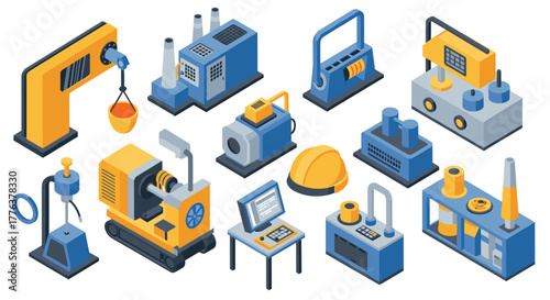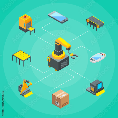 Cargo robots, flat vector isometric illustration. Automated line, cute robots packing cardboard boxes. Industrial automation and robotics concept.