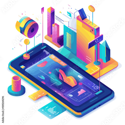 Automated mobile app testing, flat vector isometric illustration. Debugging, quality assurance, mobile test automation.