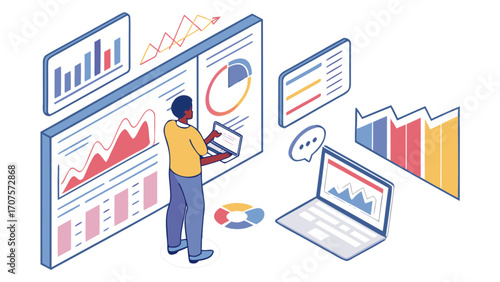 Automated production line, flat vector illustration. Robot machines working at industrial automatic conveyor belt with cardboard boxes. Robotic assembly and packaging process. Industry automation.