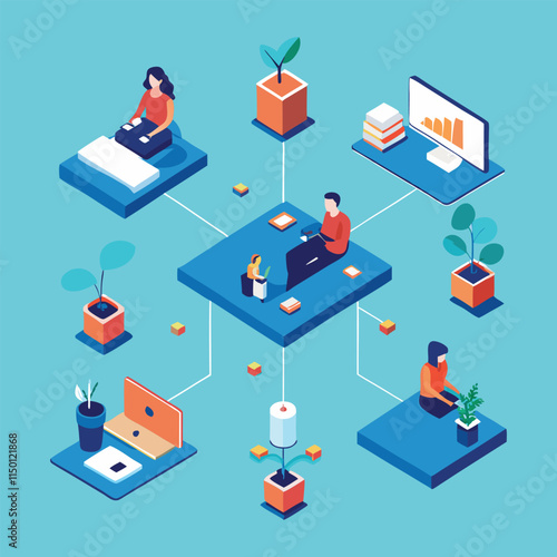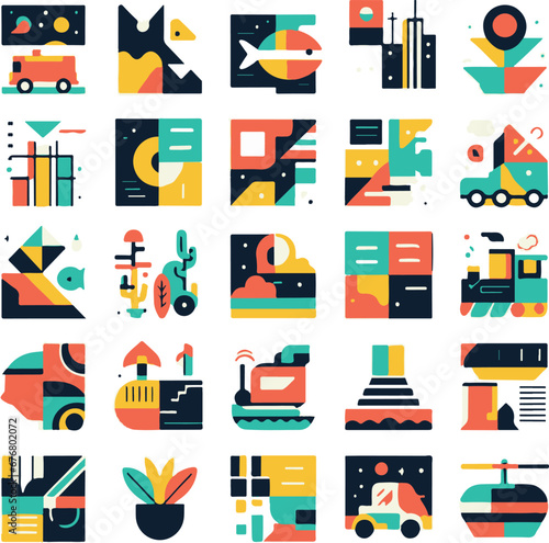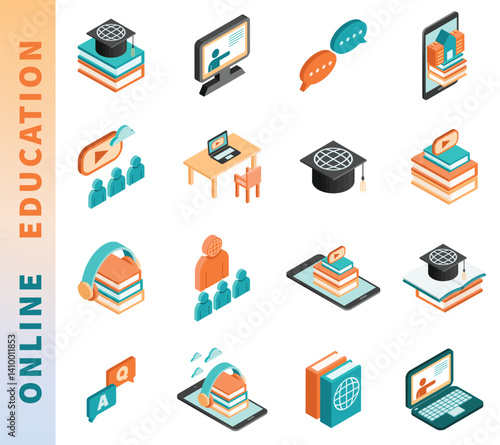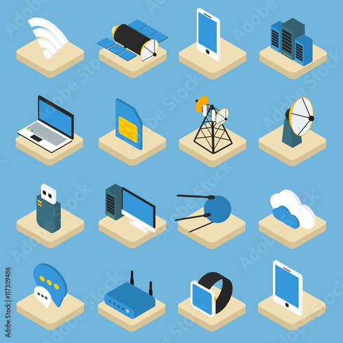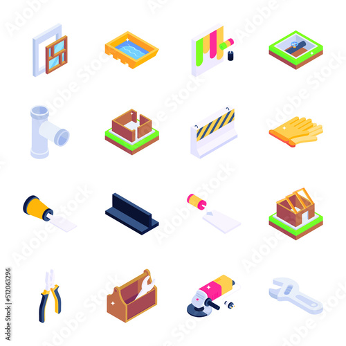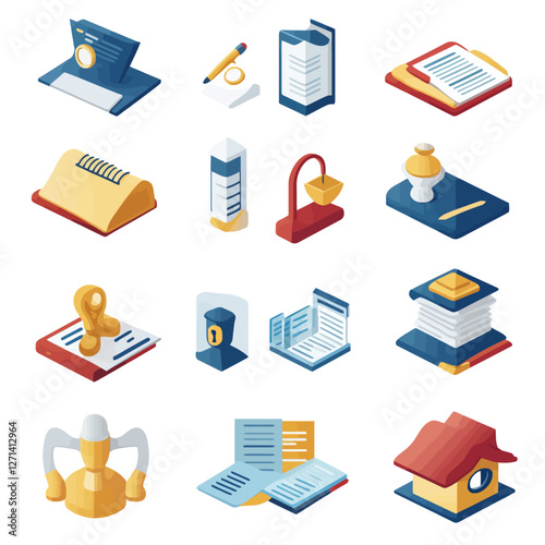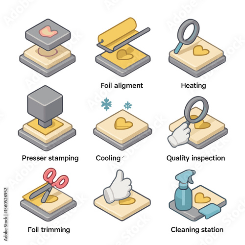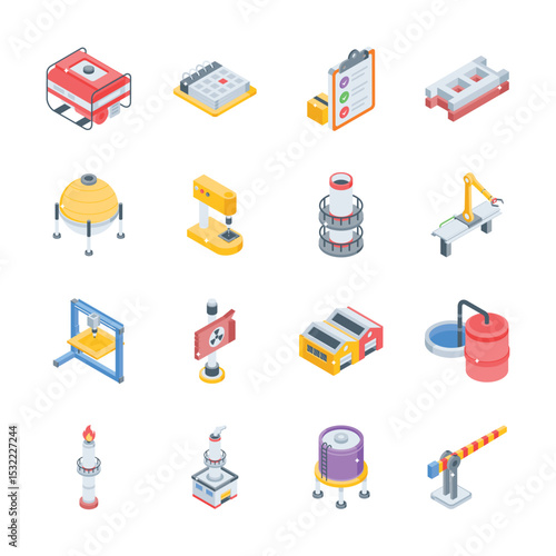 Vector automated production line flat isometric icon set. Manufacturing equipment with conveyor system, industrial robotic arm for assembly and packaging.