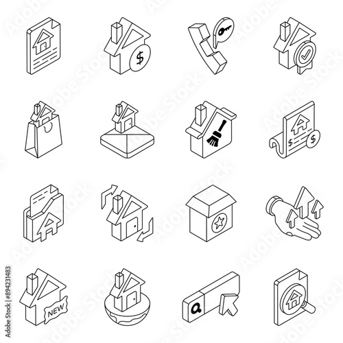 Vector automated production line isometric thin line icon set. Manufacturing equipment with conveyor system, industrial robotic arm for assembly and packaging.
