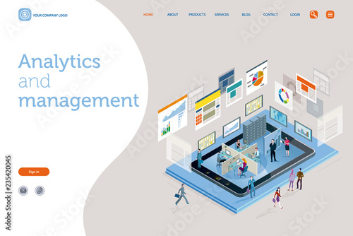 Automated software testing landing page website template. Vector isometric illustration of mobile phone and reports, diagrams, cogwheels, software bugs, robot arms. Mobile application testing concept.