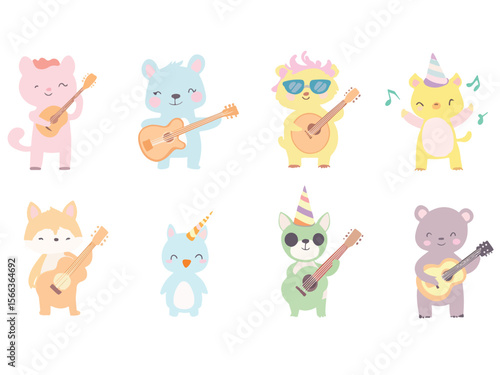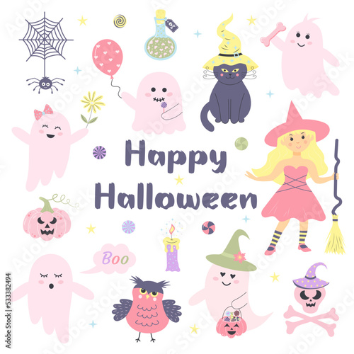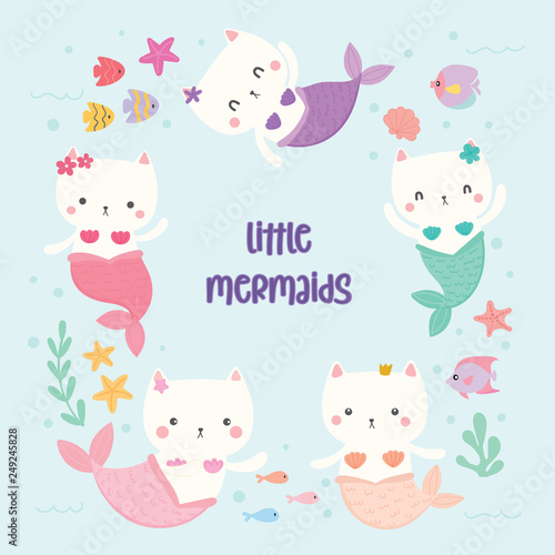 Autumn cute cat icon set for greeting card, invitation, poster, sticker, print. Vector isolated illustration of funny kittens sitting, sleeping, jumping, drinking tea, getting wet under rain.