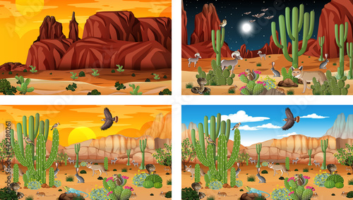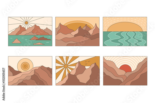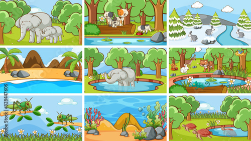Autumn landscape nature vector backgrounds set. Fall season concept posters. Forest, countryside scenery, farmland, mountain lake. Autumn wallpaper.