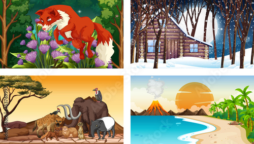 Autumn landscape nature vector backgrounds set. Fall season concept posters. Forest, countryside scenery, farmland, mountain lake. Autumn wallpaper.