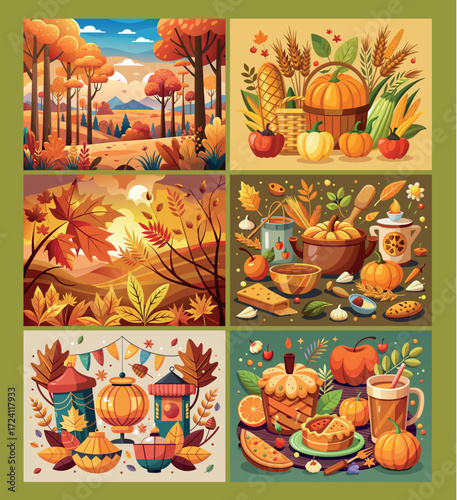 Autumn mood. Vector set of hand drawn illustrations. Fall season posters, Bullfinch bird on a tree, nature autumn landscape with river and forest.
