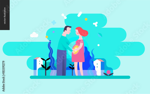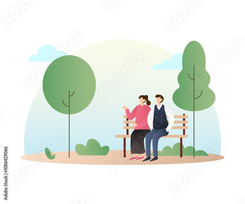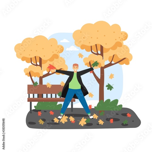 Autumn season. Happy woman walking with her pet dog in city park and enjoying fall, flat vector illustration. Outdoor activity, healthy lifestyle.