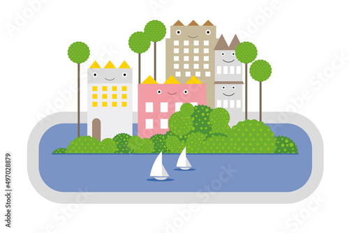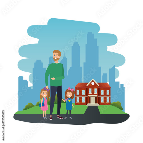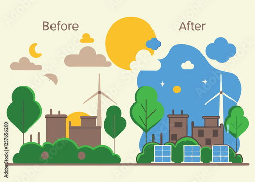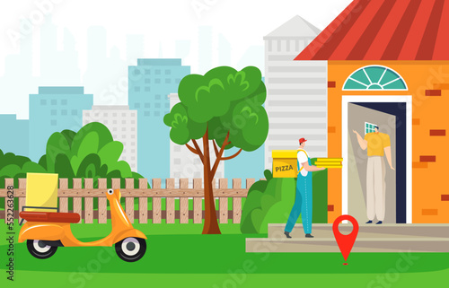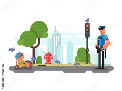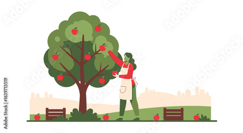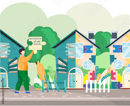 Autumn season. Man janitor cleaning street from autumn leaves with broom, flat vector illustration. Fall scenery. Street cleaner working in city park.