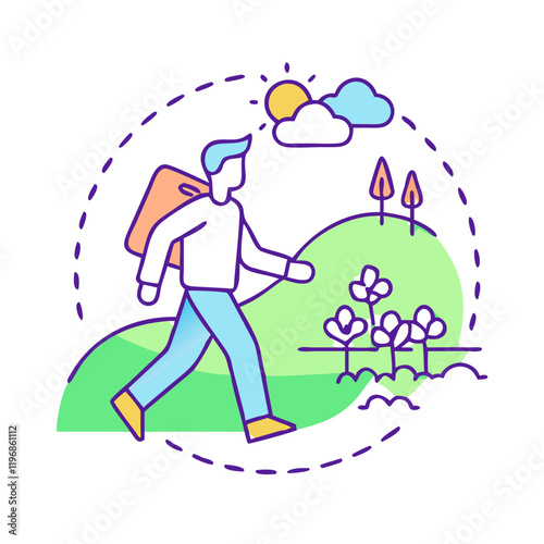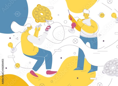 Huge sweet, succulent half fig fruit and micro male and female characters with orange and apple, vector illustration. Autumn seasonal healthy food, harvest festival concept for web banner website page