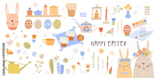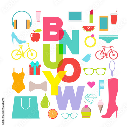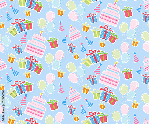 Vector seamless pattern with cute bunnies, baby toys, newborn girl booties. Baby shower background, wallpaper, fabric, wrapping paper.