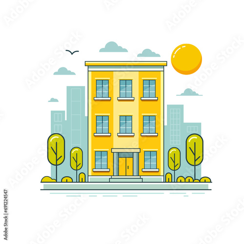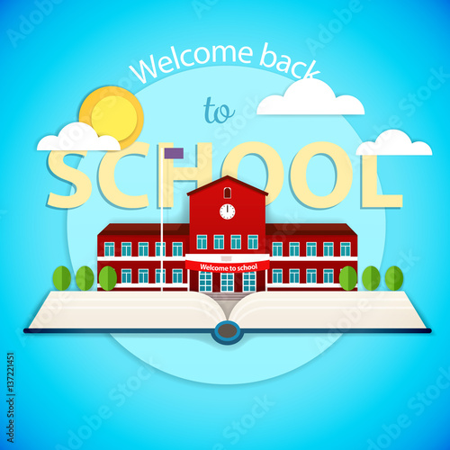 Back to school paper cut vector illustration. School building and bus over textbook pages. Welcome and invitation poster craft art style advertising design. Start of education process concept