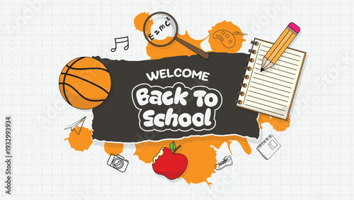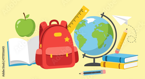 Back to school paper cut vector illustration. First september card in craft style. Knowledge day poster with layered effect. Maple, oak leaves and study accessories with round empty copy space for text
