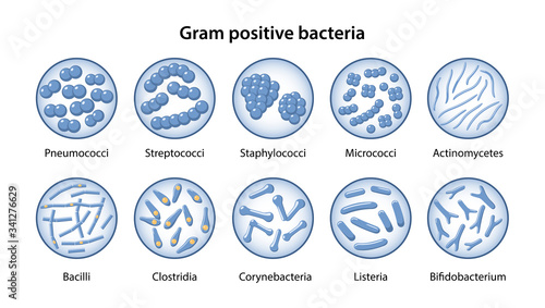 Bacterial flora in circle set, vector isolated illustration. Lactobacillus, propionibacterium, streptococcus, enterococcus, lactobacillus bulgaricus, bifidobacterium normal bacterial flora of humans.
