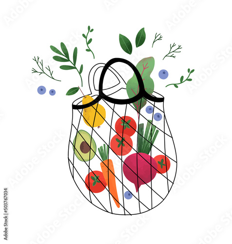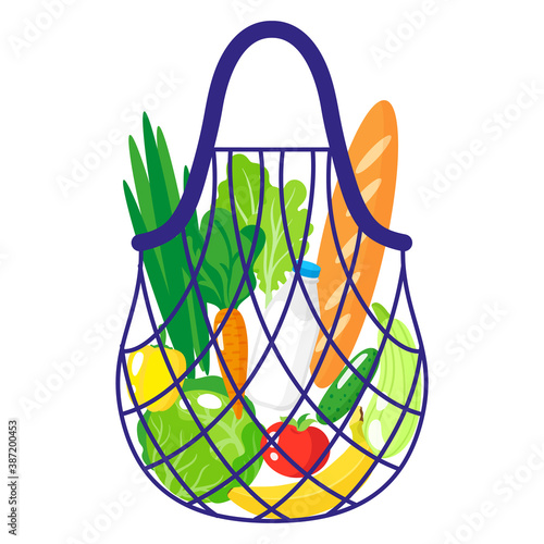 Bag mesh net with fruit vector. Food market, eco purchase and grocery shopping icon isolated on white background