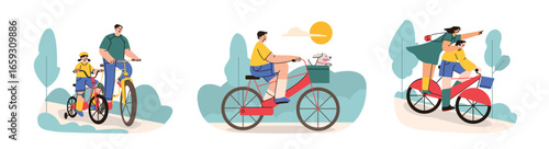 Ballet dancer exercises in the studio. Ballet dance and cycling sport vector concept illustrations. Ballerina or gymnast with ribbon. Man rides bicycle in a park. Web site design template.