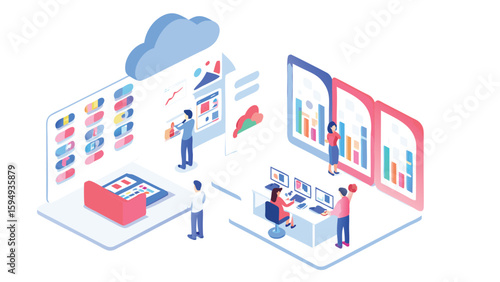 Bank office with working employee, client business people, financial advisor and cashier isometric vector illustration. Floor building interior